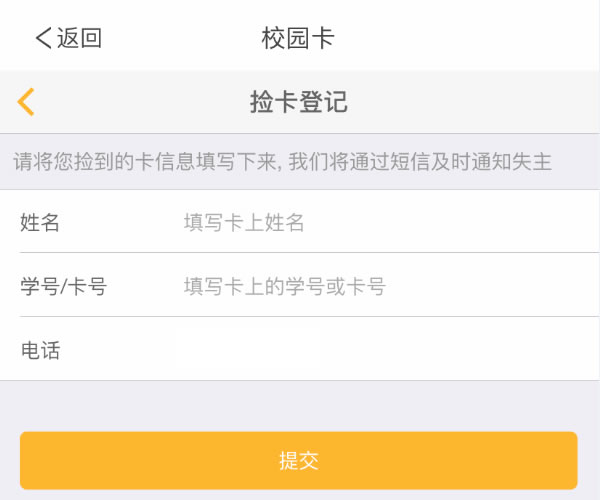 6、捡卡登记:如果您捡到一张校园卡,请送交一卡通服务中心或及时在“捡卡登记”中输入卡片上的姓名和学号、工号,系统会自动发短信及时通知失主。