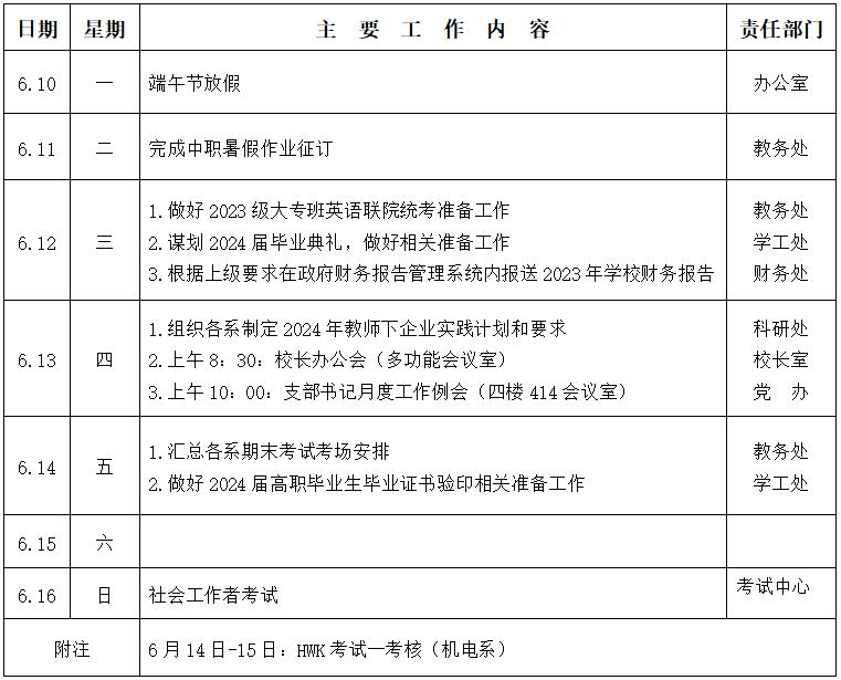 2023/2024学年第二学期第十六周工作安排表
