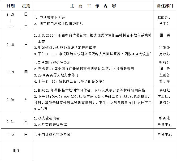 2024/2025学年第一学期第三周工作安排表